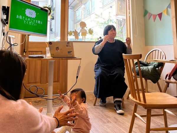 ミモザカフェ店主のゆかり校長先生の挨拶からママ学校はスタート。ゆかり先生は、3人の子育てと保育園勤務のご経験から、親子や子育てを応援し全ての人がつながる場をつくろうとミモザカフェを開いたそうです。ゆかり先生の熱い想いのこもったミモザカフェは、お子さんが遊べるフリースペースや赤ちゃん用のイスも用意された温かく素敵な場所。そんな素敵なミモザカフェに5人の生徒さんが集まりました。