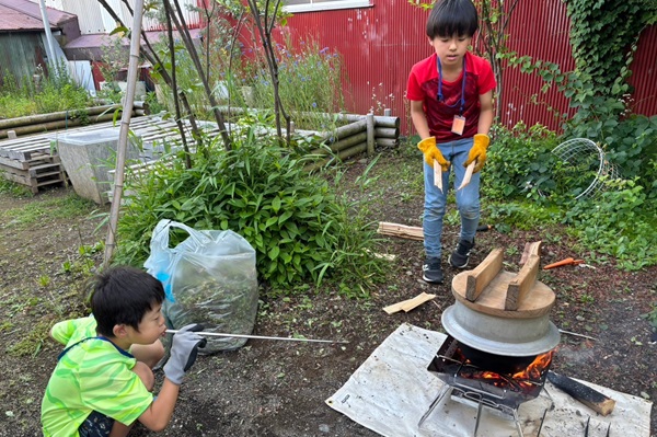 草むしり作業と並行して、男子チームはまたもや火起こし!