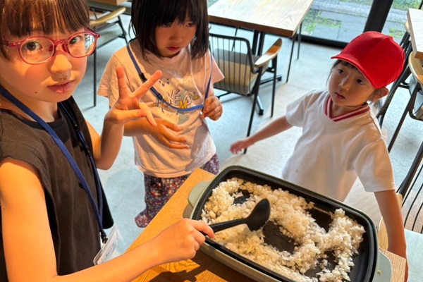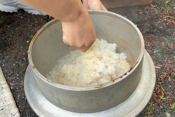 ハンバーグが焼き上がったころ、お外でもお米が完成!
