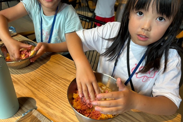 お庭が奇麗になったら、手を洗ってハンバーグ作りに取り掛かります。